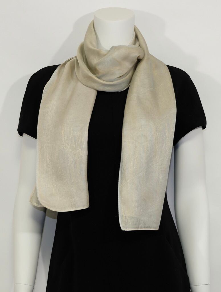 上下のシルクの間に金糸を通して織り上げたトリプル組織のストール。